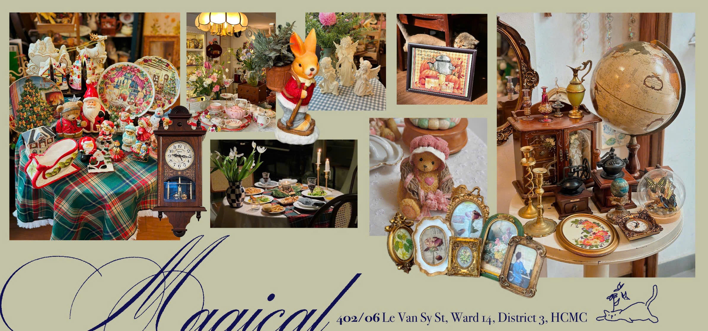 Magical là một cửa hàng vintage nằm trong con hẻm số 402 đường Lê Văn Sỹ với khoảng sân nhỏ phía trước đầy nắng và cây xanh. Ở đây, ngoài tách trà, ly thuỷ tinh hay đồ dùng bếp, bọn mình còn có những món đồ handmade được làm với rất nhiều tình yêu như nến thơm, khăn trải bàn, khăn lót hay các sản phẩm sưu tầm mà tự tay bọn mình trân quý lựa chọn từng món một.