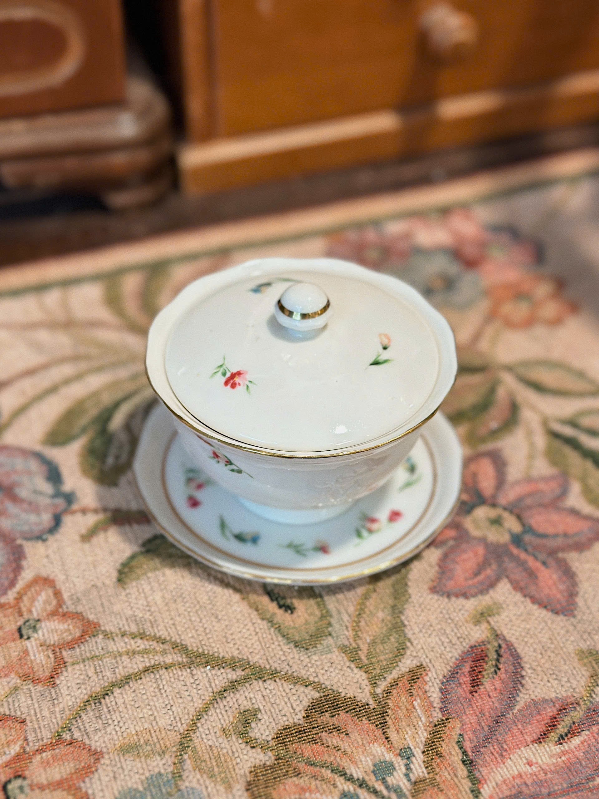Kích thước: cao 8cm, d dĩa= 9.5cm, d tách= 8cm