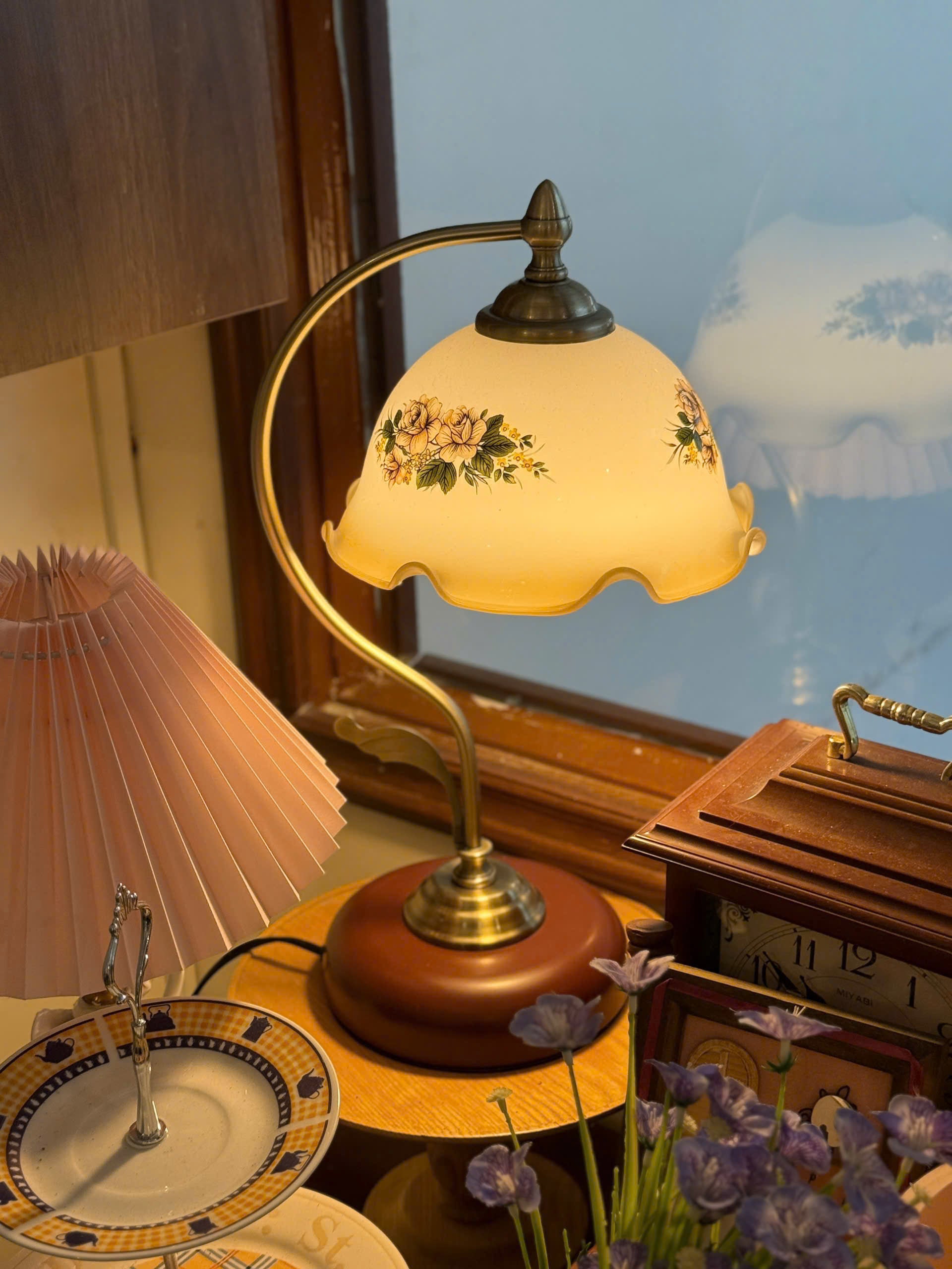 Chất liệu: Chụp thuỷ tinh, thân kim loại, đế gỗ